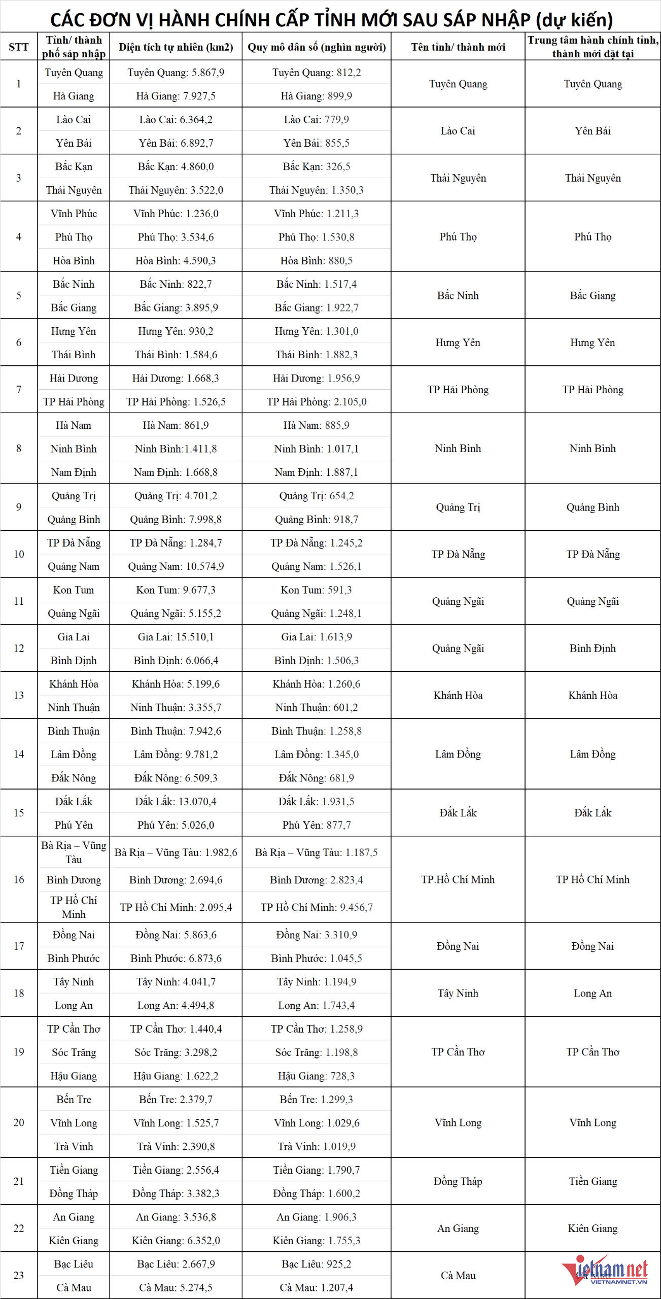 Trong đó, có 11 tỉnh, thành không thực hiện sáp nhập; 52 tỉnh, thành còn lại sáp nhập thành 23 đơn vị mới.