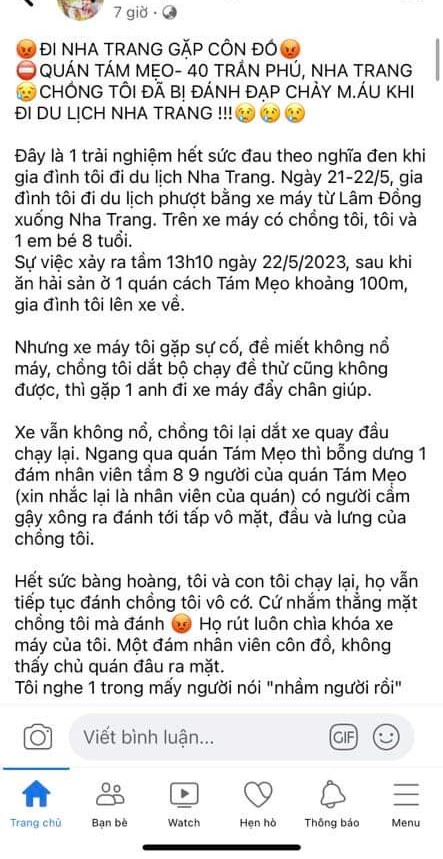 24/05/2023 01:15Chồng bị nhân viên 'đánh hội đồng', vợ lên Facebook 'chiến' cả nhà hàng