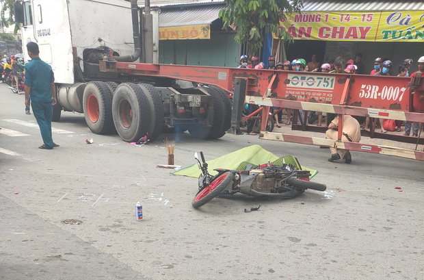 Vụ va chạm khiến xe máy ngã ra đường, người vợ bị bánh xe container cán qua người tử vong tại chỗ, còn người chồng may mắn thoát nạn.