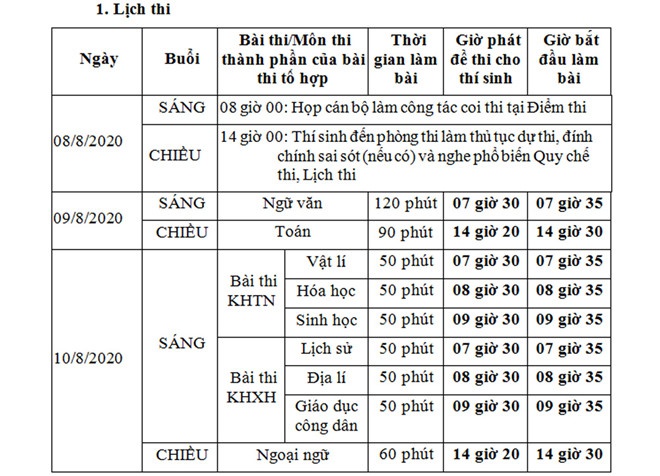 Các sở giáo dục và đào tạo, các hội đồng thi sẽ thống nhất công bố kết quả thi vào ngày 27/8/2020. Các trường THPT hoàn thành xét công nhận tốt nghiệp sơ bộ chậm nhất ngày 30/8.