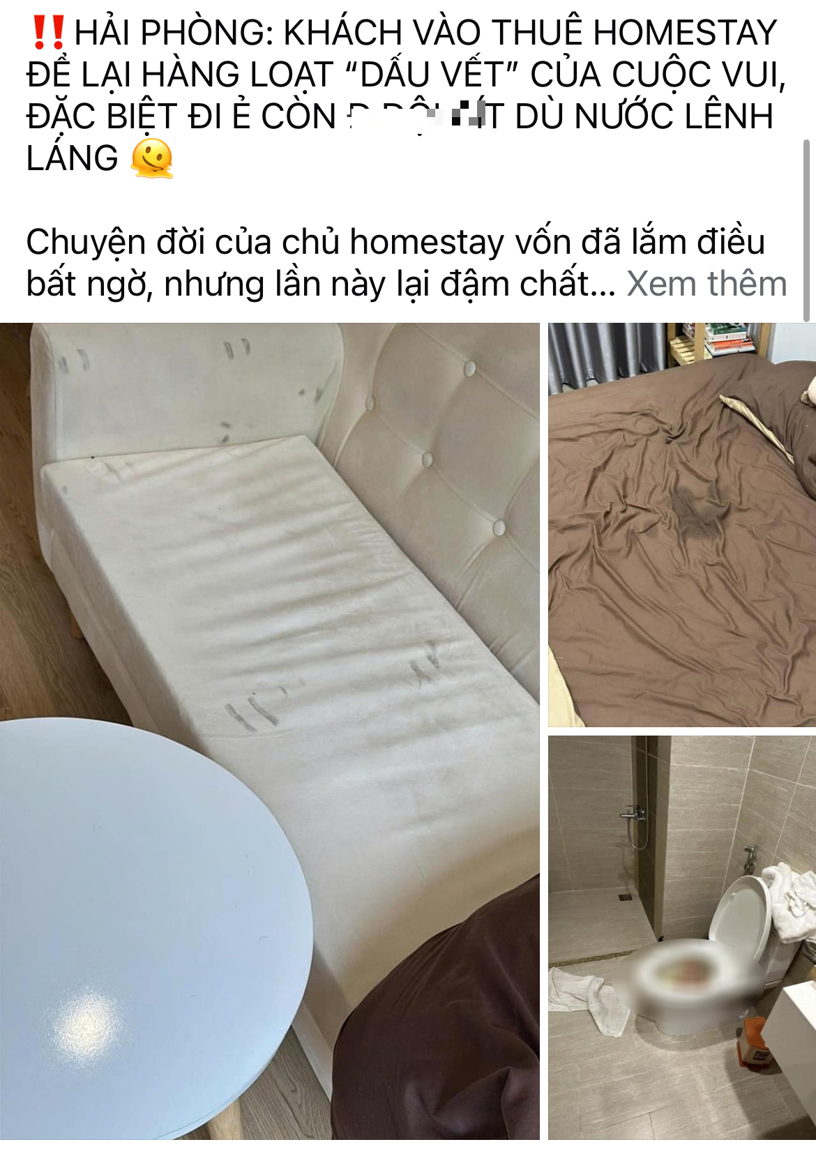 Cụ thể bài chia sẻ phản ánh: "Khi nhận lại phòng, chủ nhà chỉ biết cười khổ vì giường thì biến thành bãi 'tiểu tiện tự do', còn sofa thì được tắm trong vô số vết bẩn mà chẳng ai hiểu nổi nguồn gốc. Không chỉ dừng lại ở đó, mùi 'hương đồng gió nội' từ nhà vệ sinh khiến chủ trọ bàng hoàng, chẳng phải vì bồn cầu hỏng, mà là vì khách... quên xả nước!".