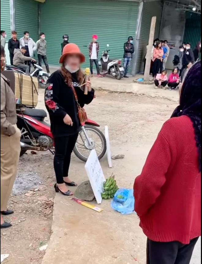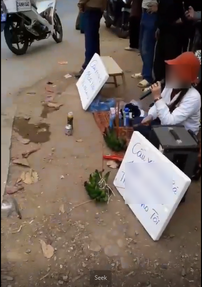 Theo dõi hình ảnh trong đoạn clip cho thấy, một người phụ nữ đeo khẩu trang kín mít, mang theo tấm biển bằng xốp có dòng chữ "Cầu xin ông bà H.X trả nợ cho tôi", kèm theo đó là cả chuối xanh, nén hương cùng bộ loa mic đến trước cửa nhà con nợ gọi tên, reo hò ầm ĩ.