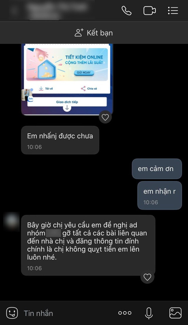 Kèm theo việc trả tiền, chị A. còn nhận được tin nhắn từ chị T., yêu cầu gỡ bài "tố", đồng thời đăng bài đính chính rằng phía quán cơm không "quỵt" tiền.