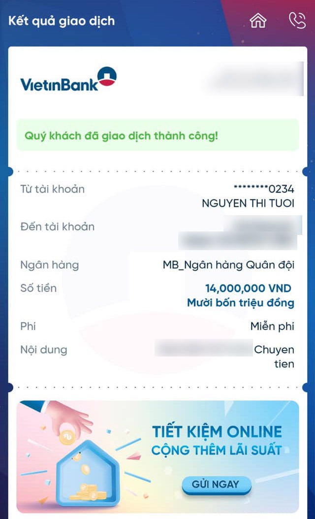 Trong bài viết của mình, chị A. đăng kèm thông tin chuyển khoản thành công số tiền 14 triệu đồng từ chủ quán cơm là chị T.