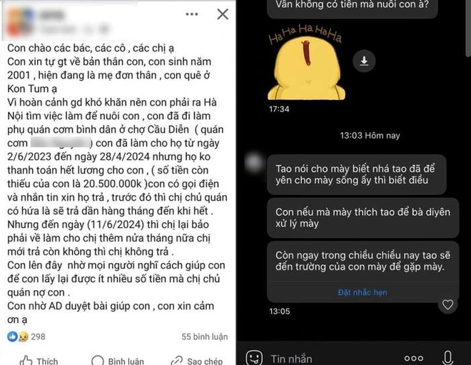 Theo thông tin chia sẻ của cô gái quê ở Kon Tum, vì hoàn cảnh nên cô phải đưa con nhỏ ra Hà Nội để kiếm kế sinh nhai, cô xin việc làm tại quán cơm ở khu chợ Cầu Diễn, từ 2/6/2023 đến 28/4/2024, nhưng chủ quán không thanh toán hết tiền lương, còn nợ lại 20.500.000 đồng, nhân viên gọi điện nhiều lần nhưng chủ quán hứa trả dần hàng tháng cho đến khi hết.
