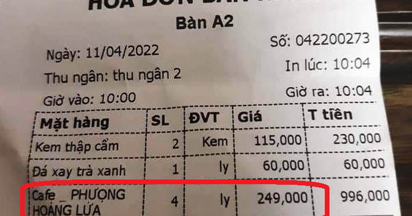 Hóa đơn tính tiền này có giá trị tổng cộng là 1.286.000 đồng. Trong đó, 4 ly cà phê Phượng Hoàng Lửa có giá đến 996.000 đồng.