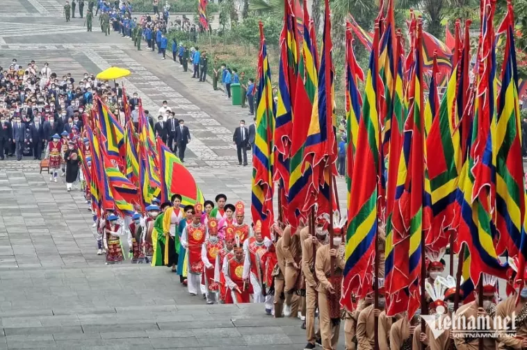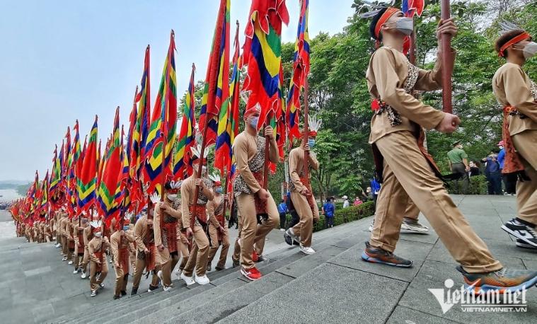 Đi đầu là đoàn Tiêu binh rước Quốc kỳ, cờ hành lễ và vòng hoa mang dòng chữ “Đời đời nhớ ơn các Vua Hùng đã có công dựng nước”. Theo sau là 14 thiếu nữ trong trang phục áo dài đỏ cùng 100 chàng trai là những thanh niên ưu tú, tượng trưng cho 100 người con được sinh ra từ bọc trăm trứng của Mẹ Âu Cơ và đoàn rước kiệu. Tiếp đó là đoàn đại biểu lãnh đạo Đảng và Nhà nước, các bộ, ban ngành Trung ương, địa phương và hàng vạn người dân.