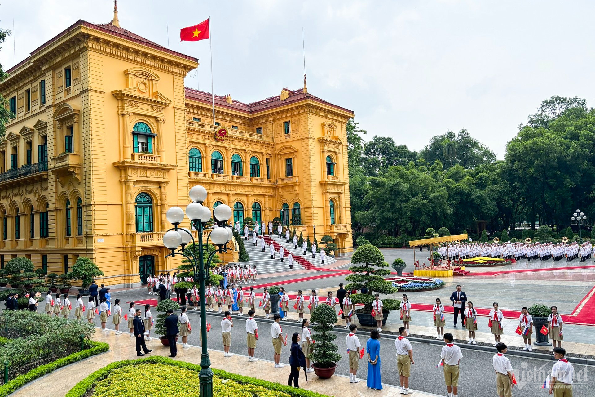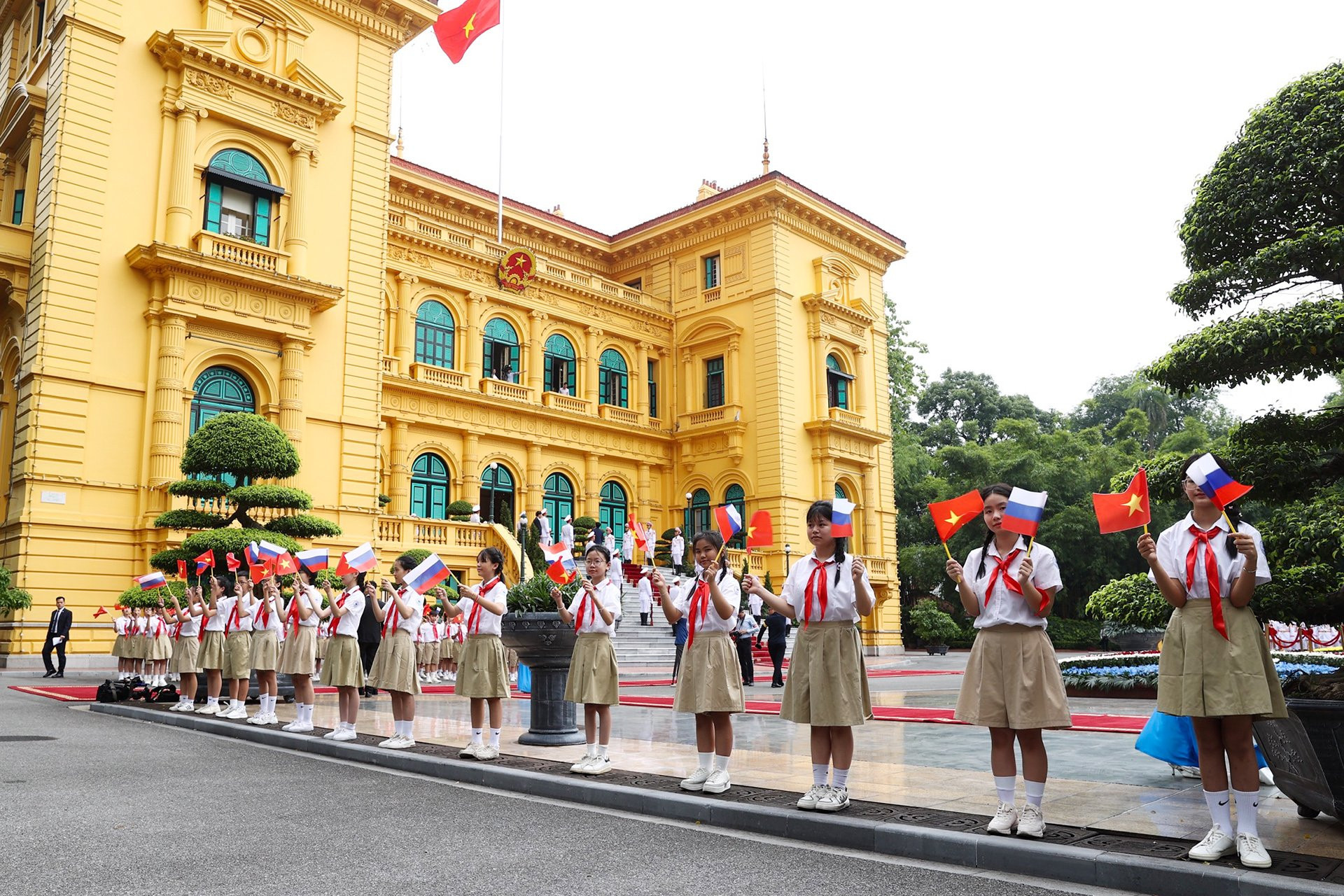 Chủ tịch nước Tô Lâm bắt tay và trò chuyện với Tổng thống Putin. Hai lãnh đạo tươi cười vẫy chào trong tiếng reo vui mừng của các em thiếu nhi thủ đô với cờ Việt Nam và Nga.
