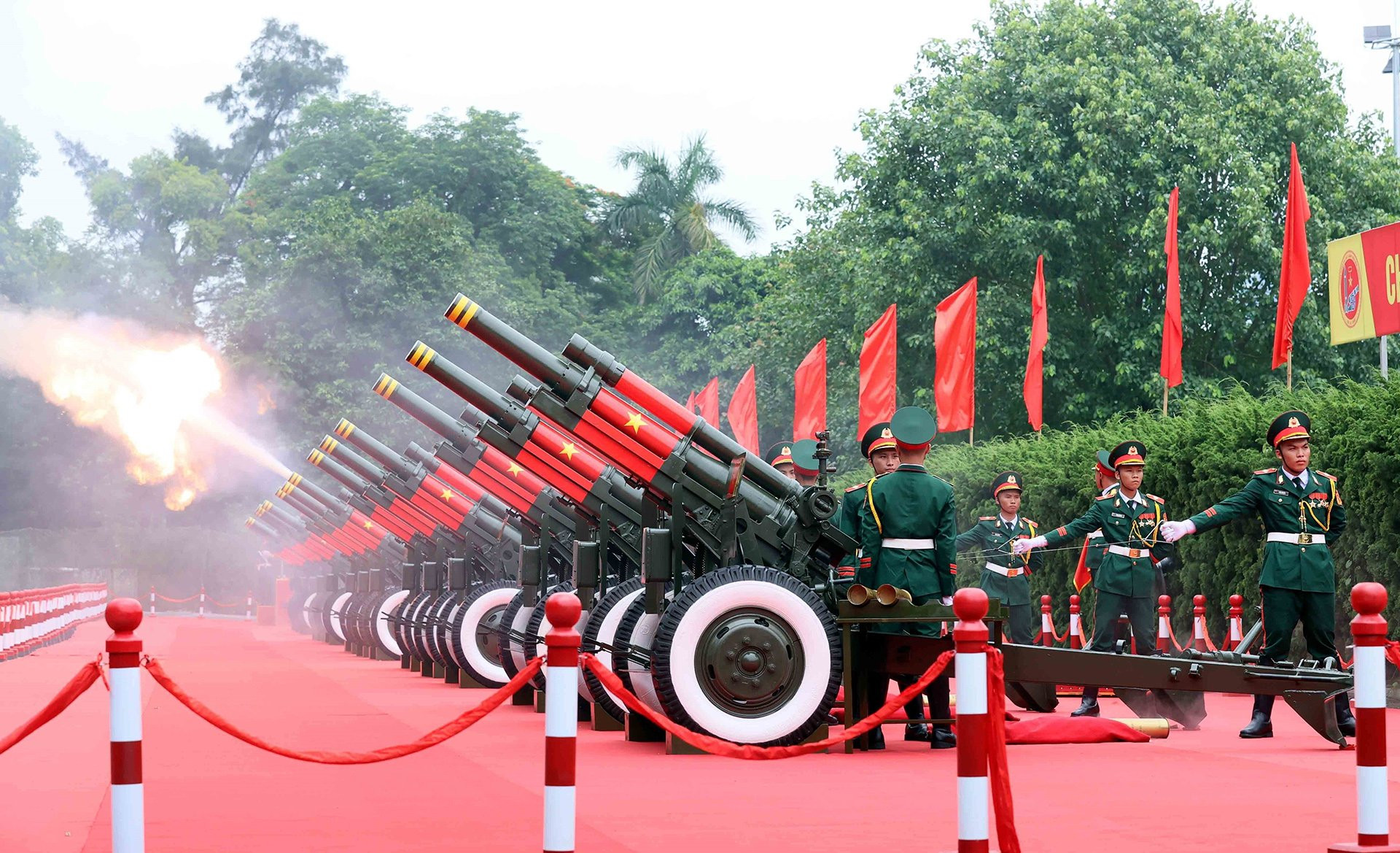 Cùng lúc này tại Hoàng Thành Thăng Long, 21 loạt đại bác rền vang được bắn lên chào mừng chuyến thăm của Tổng thống và đoàn đại biểu Liên bang Nga. Tại Phủ Chủ tịch màn hình LED truyền hình trực tiếp cảnh bắn đại bác.