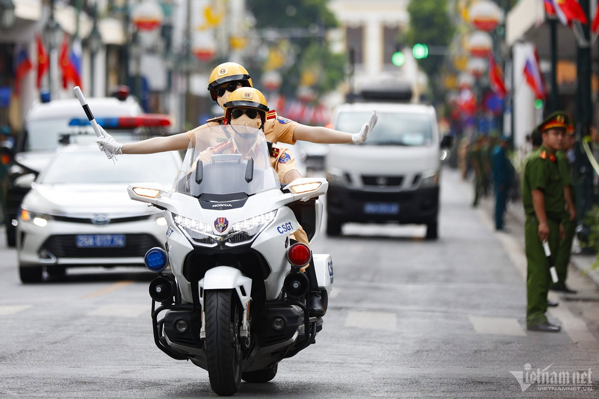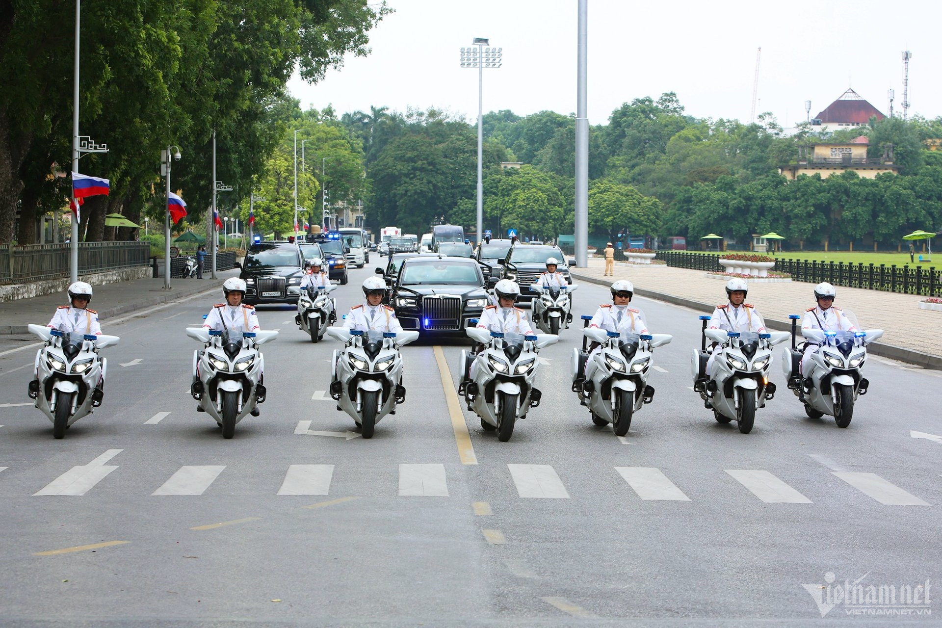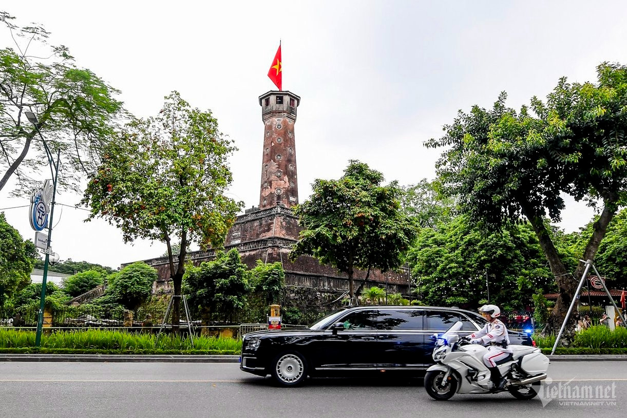 Hà Nội nắng vàng rực rỡ, quốc kỳ hai nước tung bay trong gió, nổi bật trên nền trời. Dự kiến 21 loạt đại bác sẽ được bắn ở Hoàng thành Thăng Long để chào đón chuyến thăm của Tổng thống Putin. Đây là nghi thức chào đón nguyên thủ quốc gia trang trọng nhất.