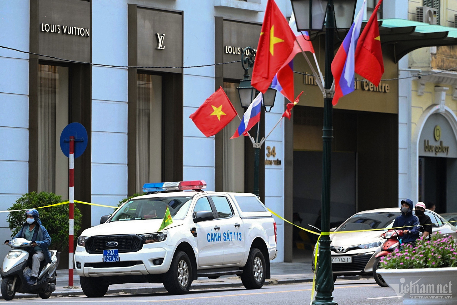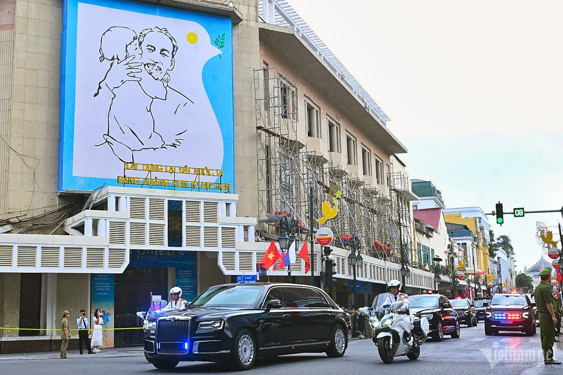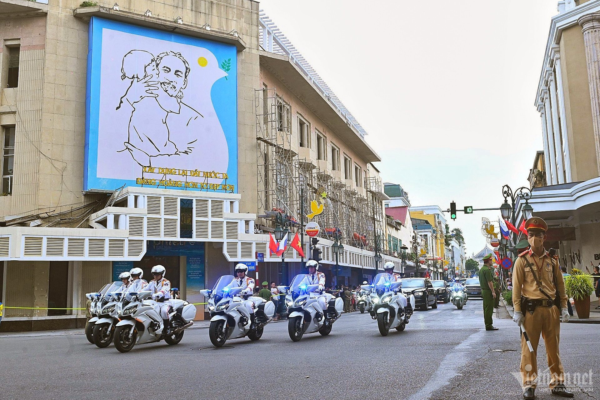 Hà Nội nắng vàng rực rỡ, quốc kỳ hai nước tung bay trong gió, nổi bật trên nền trời. Dự kiến 21 loạt đại bác sẽ được bắn ở Hoàng thành Thăng Long để chào đón chuyến thăm của Tổng thống Putin. Đây là nghi thức chào đón nguyên thủ quốc gia trang trọng nhất.
