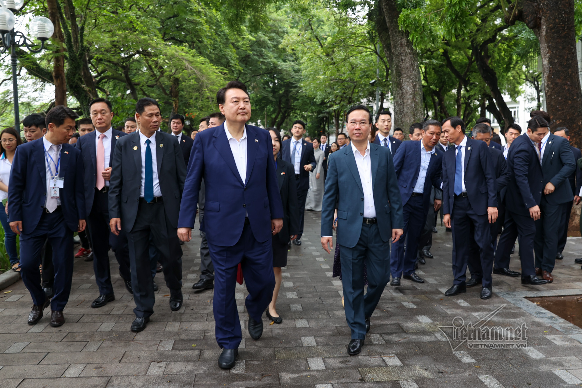 Chủ tịch nước Võ Văn Thưởng giới thiệu với Tổng thống Yoon Suk-yeol về lịch sử, sự tích Hồ Gươm, và hoạt động tham quan, vui chơi của người dân và khách du lịch tại phố đi bộ.