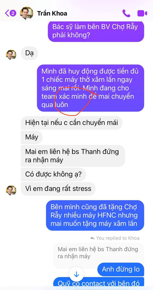 Theo đó, chị cho hay, khi nhắn tin với tài khoản Trần Khoa, chị cũng nói sẽ cho xác minh trước khi chuyển máy thở sang. Mặt khác, chị cũng không nhận đầu mối liên hệ mà tài khoản Trần Khoa giới thiệu, do đã từng làm việc và hỗ trợ Bệnh viện Chợ Rẫy.