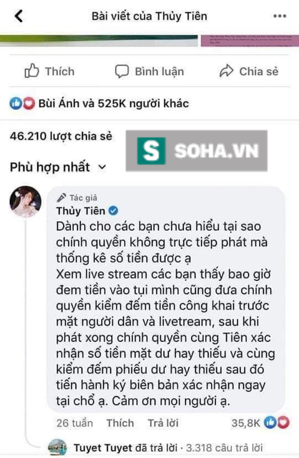 Tuy nhiên, cư dân mạng đã đem điều này ra soi chiếu với phát ngôn của Thủy Tiên vào tháng 11/2020 thấy nhiều điểm khác biệt. Theo đó, nữ ca sĩ này chia sẻ trên tài khoản trang cá nhân có tích xanh, nói rằng: "Xem live stream các bạn thấy bao giờ đem tiền vào tụi mình cũng đưa chính quyền kiểm đếm tiền công khai trước mặt người dân và livetream. Sau khi phát xong chính quyền cùng Tiên xác nhận số tiền mặt dư hay thiếu và cùng kiểm đếm phiếu dư hay thiếu sau đó tiến hành ký biên bản xác nhận ngay tại chỗ ạ. Cảm ơn mọi người ạ".