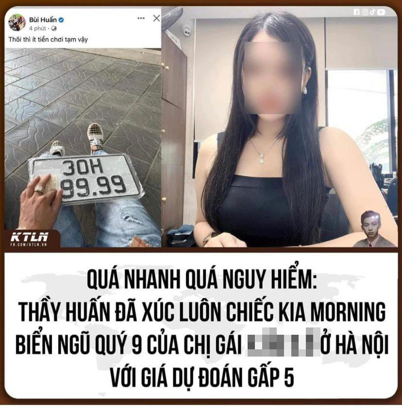 Theo đó, Facebook Bùi Huấn (Huấn Hoa Hồng) đăng tải về một biển số xe 30H-x99.99. Trong đó, một chữ số phía trước đã bị người này che mất. Nhiều trang mạng xã hội sau đó đã chia sẻ lại hình ảnh này và cho rằng chủ xe Kia Morning biển số 30H-999.99 đã bán lại chiếc ô tô cho người này với giá gấp 5 lần ban đầu.