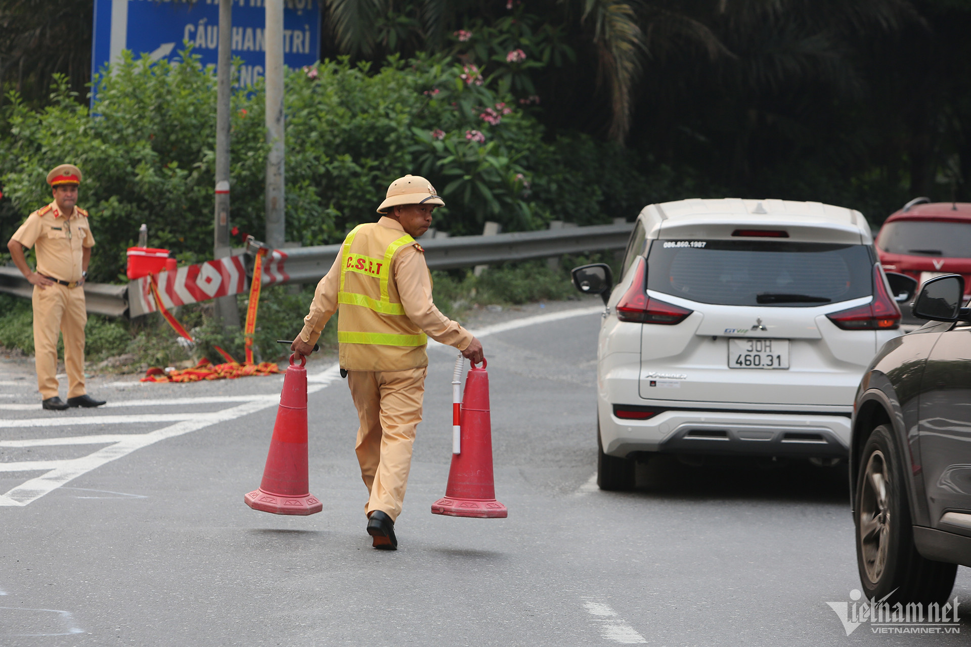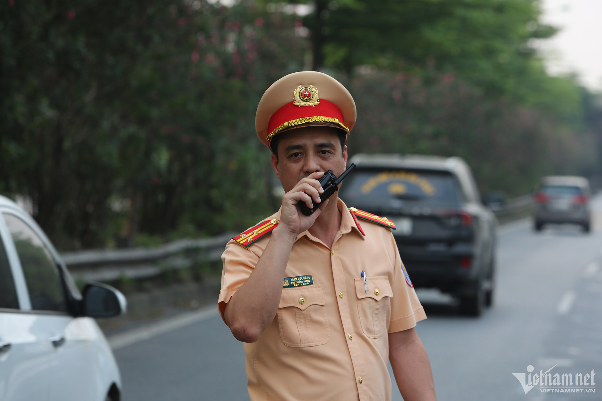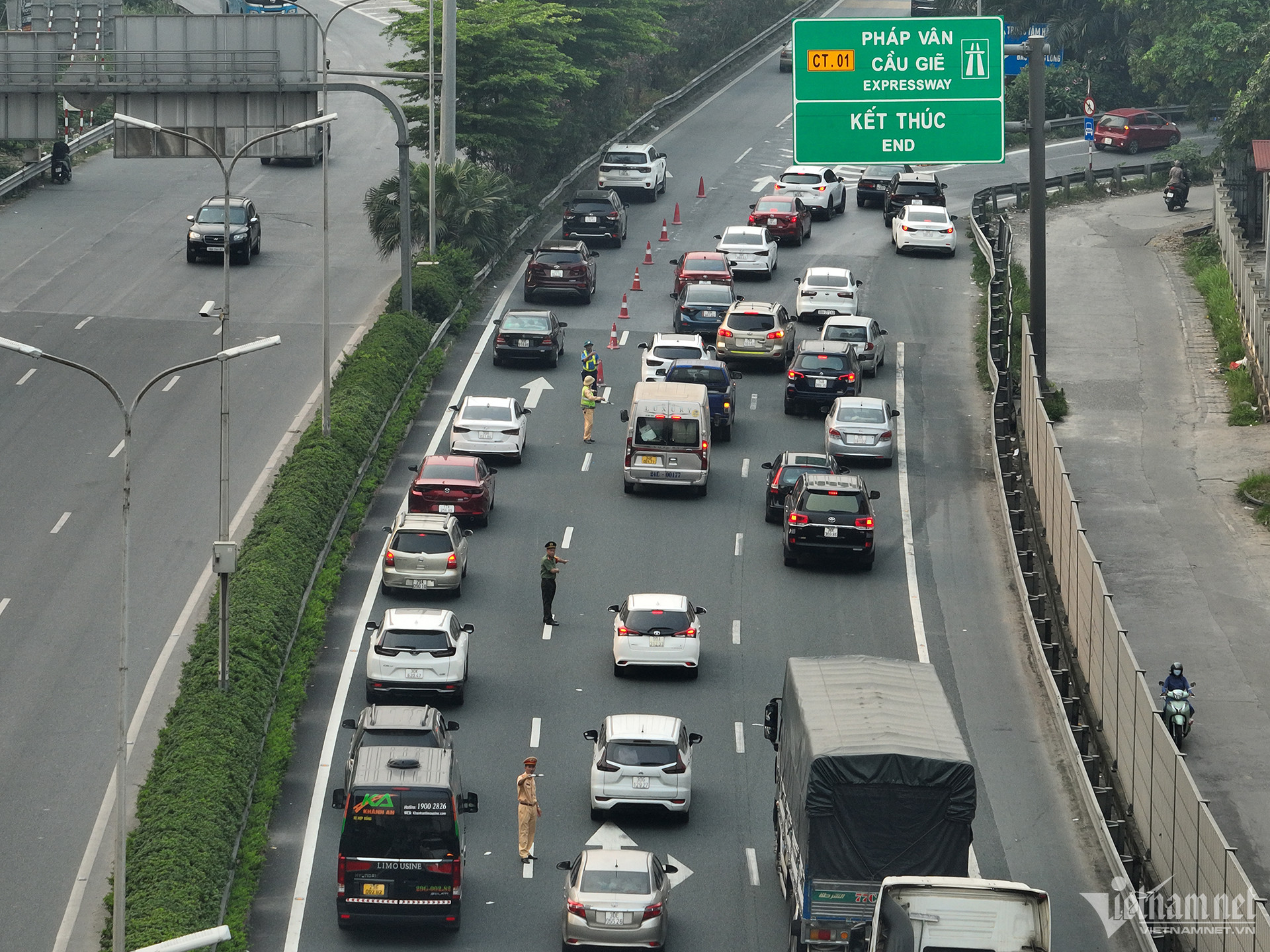 Đến 17h30, lượng ô tô dồn từ điểm cuối cao tốc Pháp Vân - Cầu Giẽ vào đường Đỗ Mười ngày càng đông, cán bộ chiến sĩ của Đội CSGT đường bộ số 14 tích cực phân luồng phương tiện.