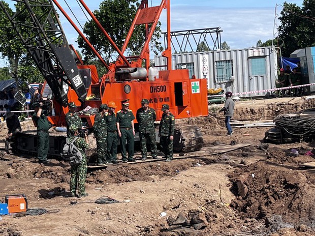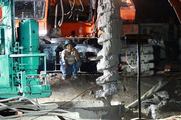 Đến trưa nay, 10-1, gàu múc đất đã lấy đất xong 1 phía vách đến cao độ khoảng 13 - 14 m so với mặt đất.