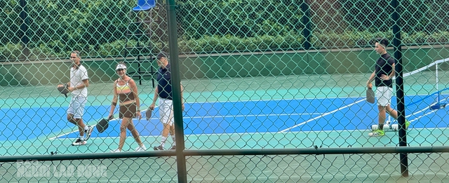 Ông Bill Gates trong trang phục quần short màu trắng, áo thun xanh navy và đội mũ màu đen, trong khi bạn gái mặc trang phục thể thao, mũ màu trắng. Ông và bạn gái cùng 2 người Việt, chia thành 2 đội tổ chức trận đấu đôi.