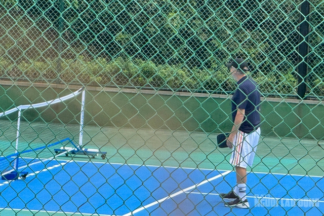 Phía ngoài cổng sân tennis có 2 bảo vệ túc trực. Đến 12 giờ, ông Bill Gates và bạn gái dừng chơi và di chuyển vào bên trong khuôn viên resort.