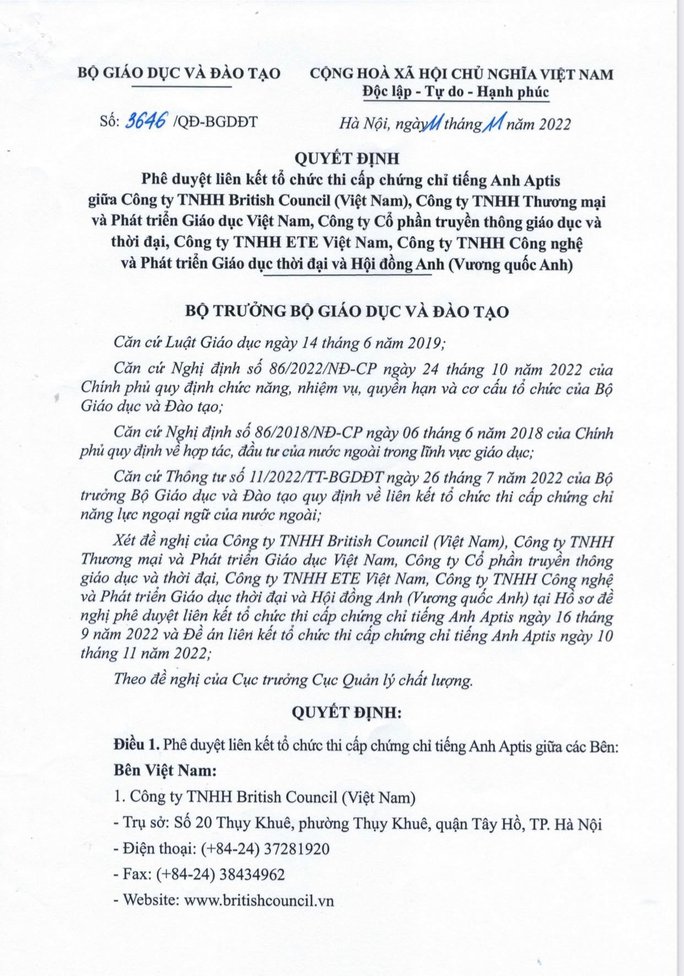 Cụ thể, theo quyết định sáng 11/11, Bộ GD&ĐT đã phê duyệt việc liên kết tổ chức thi cấp chứng chỉ tiếng Anh Aptis giữa Công ty TNHH British Council (Việt Nam), Công ty TNHH Thương mại và Phát triển Giáo dục Việt Nam, Công ty Cổ phần Truyền thông Giáo dục và Thời đại, Công ty TNHH ETE Việt Nam, Công ty TNHH Công nghệ và Phát triển Giáo dục Thời đại cùng Hội đồng Anh (Vương quốc Anh).