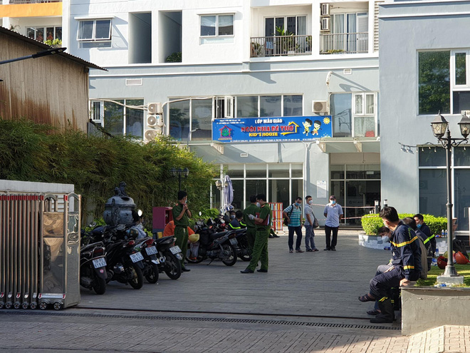 Tại khu vực sảnh, nhiều người chứng kiến hai mẹ con phi thân từ khu vực lan can căn hộ đang rực lửa xuống đất và tử vong.