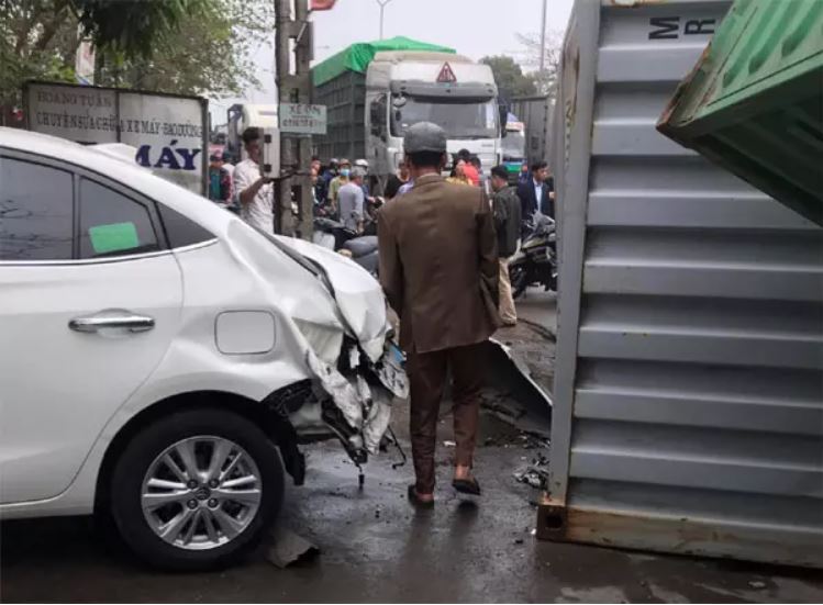 Chỉ trong tích tắc sau va chạm, thùng container và rơ-móc nghiêng và đổ dần về phía bên phải. Thời điểm này, chiếc Toyota Vios màu trắng do một phụ nữ điều khiển đang chờ tới...