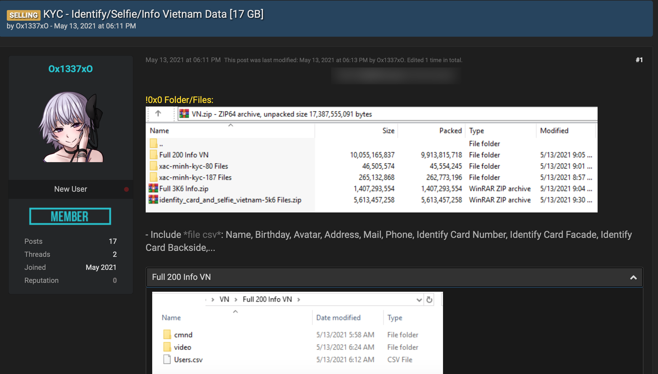 Trên diễn đàn R*******, một người đang rao bán hơn 17GB dữ liệu cá nhân của người dùng Việt Nam. Theo người này, số dữ liệu này bao gồm tên, ngày sinh, ảnh đại diện, địa chỉ nhà riêng, địa chỉ email, số điện thoại, số chứng minh thư, ảnh mặt trước chứng minh thư, ảnh mặt sau chứng minh thư và ảnh/video selfie.