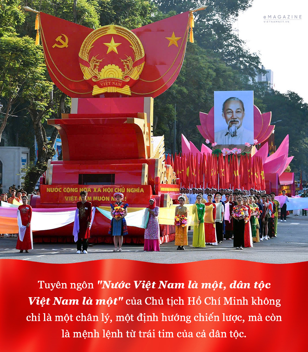 Tuyên ngôn "Nước Việt Nam là một, dân tộc Việt Nam là một" của Chủ tịch Hồ Chí Minh không chỉ là một chân lý, một định hướng chiến lược, mà còn là mệnh lệnh từ trái tim của cả dân tộc. Trong khói lửa chiến tranh, câu nói ấy trở thành nguồn sức mạnh to lớn, truyền cảm hứng mạnh mẽ, tạo động lực cho hàng triệu người Việt Nam bước ra mặt trận với ý chí "quyết tử cho Tổ quốc quyết sinh". Lời của Bác là lời hiệu triệu thiêng liêng, là biểu tượng của lòng quyết tâm vượt qua mọi đau thương, gian khổ, để giành bằng được độc lập, tự do cho dân tộc, thống nhất cho đất nước và hạnh phúc ấm no cho Nhân dân.