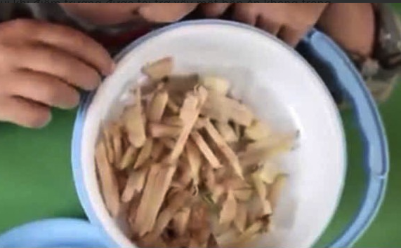 Trong phóng sự ghi lại cảnh một phụ huynh đào gừng tươi, sau đó thái lát nhỏ, kèm theo một ít muối trắng, để cho con mang tới trường ăn cơm trưa. Chiếc cặp lồng cơm với gừng và muối trắng chính là bữa ăn trưa của học sinh này tại lớp.