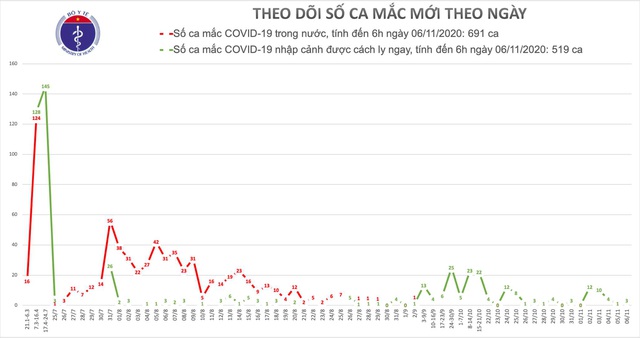 - Tính đến 6h ngày 06/11: Việt Nam có tổng cộng 691 ca mắc COVID-19 do lây nhiễm trong nước, trong đó số lượng ca mắc mới tính từ ngày 25/7 đến nay: 551 ca.