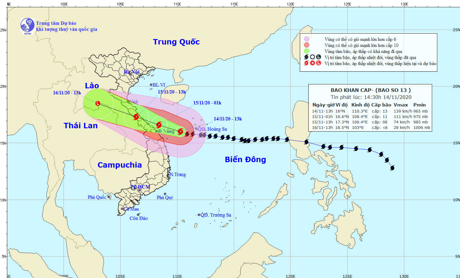 Chiều 14/11, ông Trần Quang Năng, Trưởng phòng dự báo thời tiết, Trung tâm Dự báo Khí tượng thủy văn Quốc gia cho biết, hiện bão số 13 đang cách Đà Nẵng khoảng 187km, Thừa Thiên Huế khoảng 280km, Quảng Trị khoảng 330km. Sức gió mạnh nhất cấp 12-13 (115-150km/h), giật cấp 16.