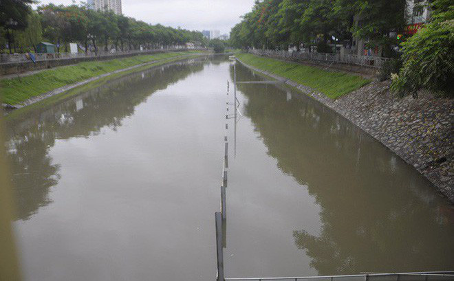 Tại khu vực thí điểm xử lý làm sạch sông Tô Lịch bằng công nghệ Nhật Bản của Công ty JVE nằm sát đầu đường Hoàng Quốc Việt (quận Cầu Giấy) mực nước vượt qua cả khu vực che chắn, giữa dòng chỉ còn nổi một tấm biển.