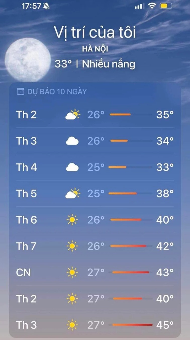 Mới đây, báo điện tử VTC News dẫn thông tin cập nhật từ một ứng dụng dự báo thời tiết (app) trên điện thoại cho hay, đỉnh điểm nhiệt độ ở Hà Nội trong ngày 30/4 có thể lên tới 45 độ C đã thu hút sự quan tâm của nhiều người.