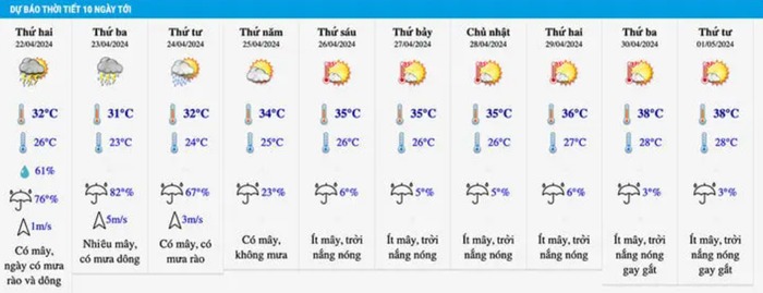 Báo Tuổi trẻ Online dẫn thông tin, dự báo thời tiết của từng địa phương trong 10 ngày tới của Trung tâm Dự báo khí tượng thủy văn quốc gia cho thấy trong 5 ngày nghỉ lễ 30/4 và 1/5 (từ 27/4 đến 1/5), tại nhiều tỉnh, thành phố khả năng xảy ra một đợt nắng nóng gay gắt, nhiều nơi đặc biệt gay gắt.
