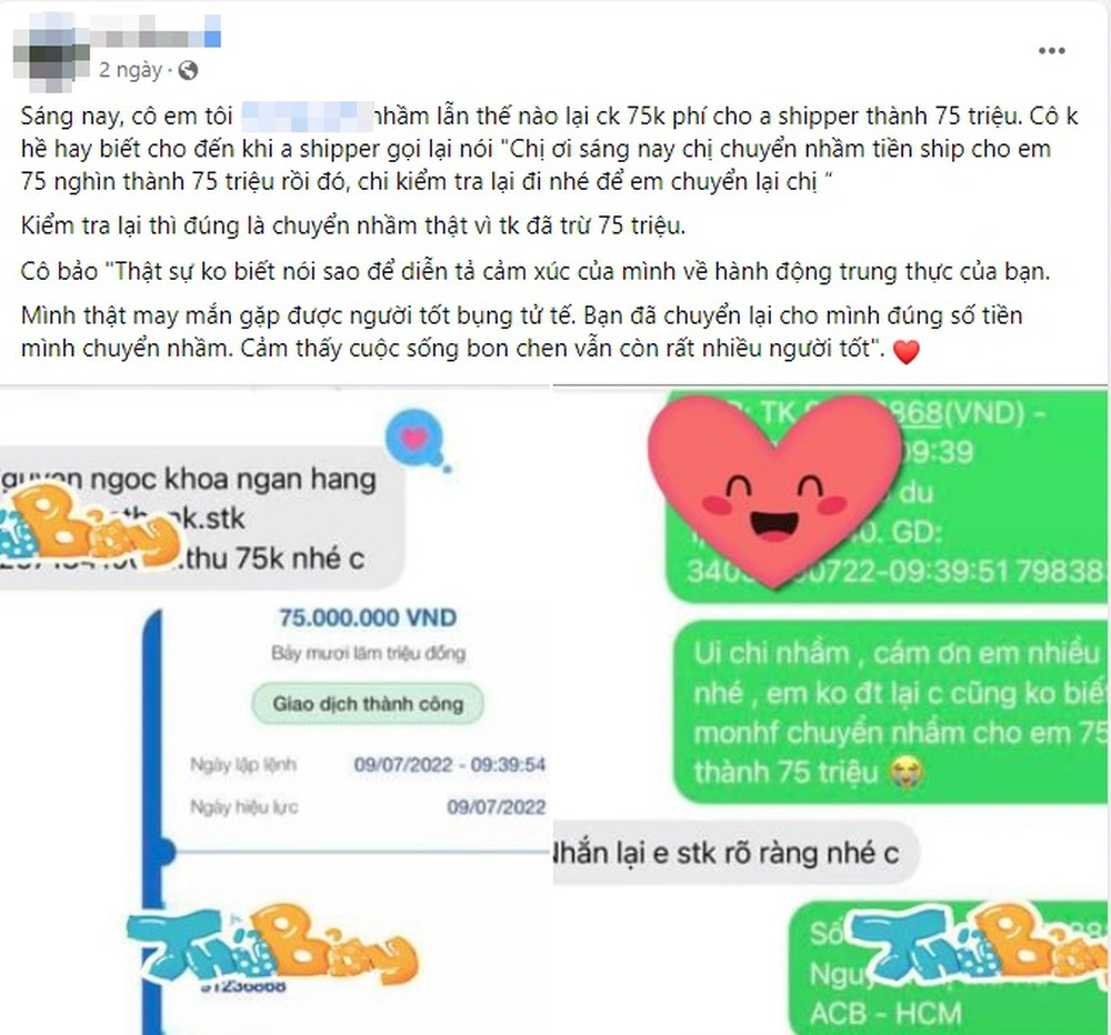 Cụ thể, tài khoản đăng tải viết chia sẻ, chị Nguyễn Thị Thu Hà (39 tuổi) chuyển nhầm tiền mà không hề hay biết cho đến khi nam shipper gọi thông báo: "Chị ơi, sáng nay chị chuyển nhầm tiền ship cho em 75 nghìn đồng thành 75 triệu đồng rồi đó, chị kiểm tra lại đi nhé để em chuyển lại". Khi kiểm tra lại thì nữ khách hàng mới ngỡ ngàng vì chuyển nhầm số tiền lớn.