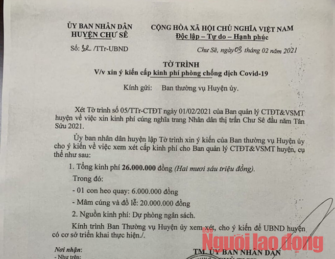Theo đó, ngày 1-2, Ban quản lý Công trình đô thị và Vệ sinh môi trường huyện Chư Sê (BQL) có tờ trình xin kinh phí cúng nghĩa trang nhân dân thị trấn Chư Sê đầu năm Tân Sửu 2021. Đến ngày 3-2, UBND huyện Chư Sê có Tờ trình số 32/TTr-UBND ngày 3-2-2021 gửi Ban Thường vụ Huyện ủy Chư Sê "xin ý kiến cấp kinh phí phòng chống dịch Covid-19".