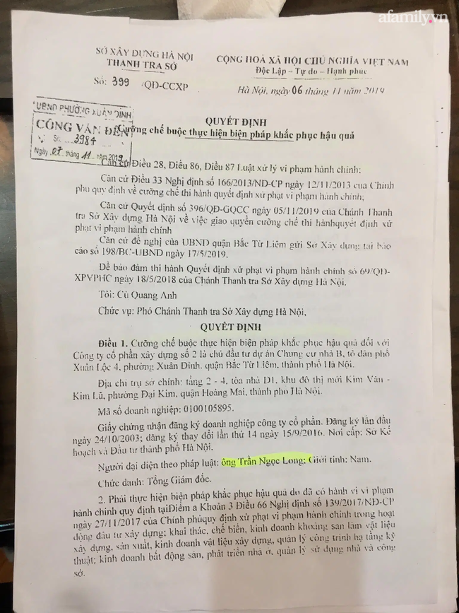 Khi thấy chủ đầu tư chỉ nộp phạt, không chịu khắc phục hậu quả, ngày 6/11/2019, Thanh tra Sở Xây dựng tiếp tục ra quyết định cưỡng chế buộc đối với Vina2.“