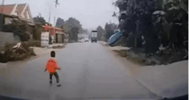 Theo nội dung đoạn clip đăng tải cho thấy, trên một con đường làng không quá rộng, một bé trai đang nô đùa với chị gái thì bất ngờ băng qua đường không quan sát. Đúng lúc đó một ô tô chạy tới, để tránh va chạm thương tâm, tài xế đã lập tức bẻ lái và phanh gấp.
