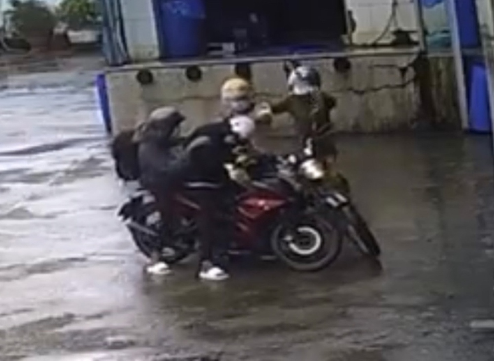 Theo đoạn clip ghi lại, nam sinh lái xe ngồi trước đã tháo mũ bảo hiểm, nhưng người cảnh sát trật tự vẫn cầm mũ bảo hiểm đập vào đầu nam sinh này.