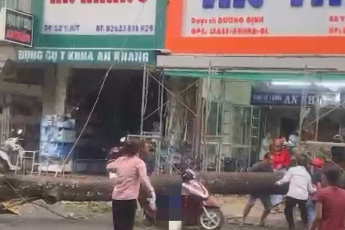 Cụ thể, khoảng 15h cùng ngày, tại góc đường Y Jut - Nơ Trang Lơng (TP Buôn Ma Thuột), chị T.T.K.N. (26 tuổi, trú xã Hòa Phú, TP Buôn Ma Thuột) chạy xe máy trên đường thì bị cây sao đen bật gốc, đổ ngang, đè trúng người và xe máy.