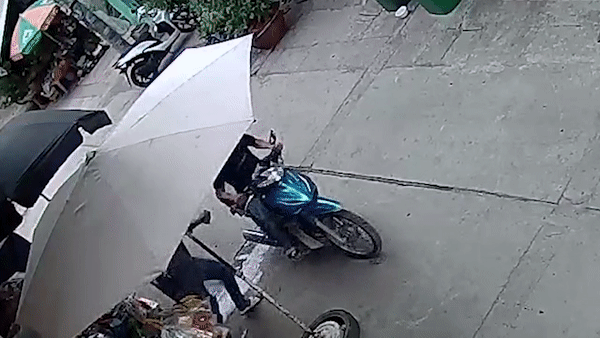 Sau một lúc quan sát, mộg người tiến vào tiệm tạp hóa, dùng một tay che mặt chị H., tay còn lại lấy điện thoại để trên tủ đông. Rất nhanh chóng, đối tượng vội bỏ chạy, nhảy lên xe đồng bọn để tẩu thoát.