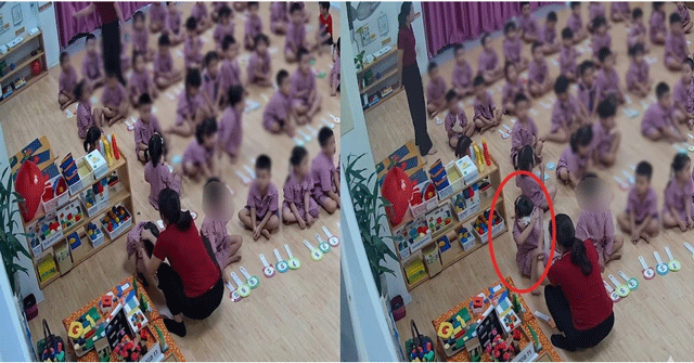 Trong video, một cô giáo mặc áo đỏ từ bên ngoài bước vào lớp, sau đó có hành động bị cho là túm tóc và đánh vào đầu một bé trai. Ngay lập tức, đứa trẻ có phản ứng ôm đầu, thể hiện sự hoảng sợ.