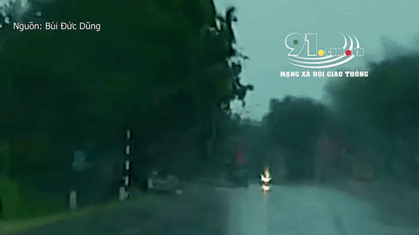 Hình ảnh từ đoạn clip cho thấy, thời điểm này trời mưa lớn. Từ đằng xa có 2 người chở nhau trên xe máy đang di chuyển chầm chậm ở làn đối diện. Bất ngờ, tia sét đánh trúng cột đèn bên đường gây tóe lửa, đúng lúc 2 ngày này đi tới.
