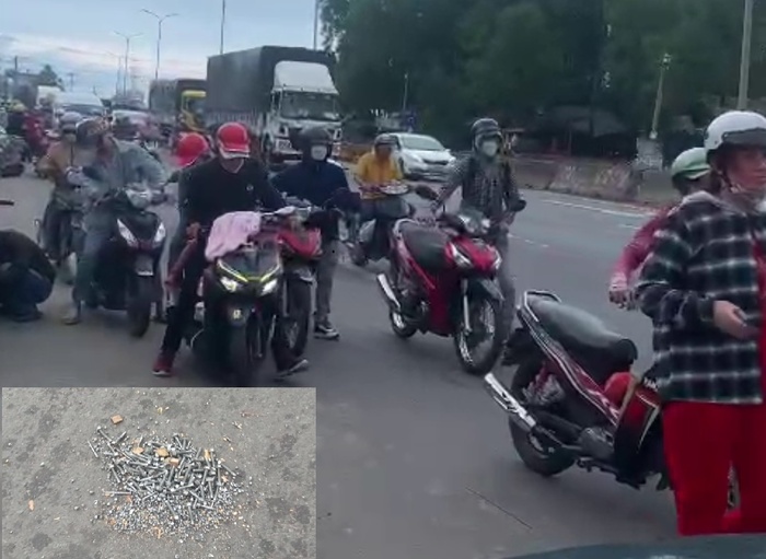 Tình trạng đinh rơi vãi trên đường đúng giờ công nhân tan ca nên dòng xe cán đinh kéo dài. Một số người dắt xe hàng km qua khu vực.
