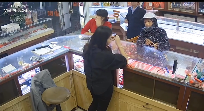 Đồng thời, lợi dụng lúc nhân viên bán hàng không chú ý, người phụ nữ này nhanh tay trộm đi 1 sợi dây chuyền rồi thả vào trong ống tay áo. Lúc sau, nữ nhân viên bán hàng không để ý, người phụ nữ này đã lấy luôn sợi dây chuyền cho vào trong tay áo.