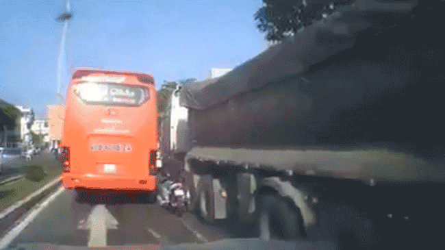"May là đường tắc nên ông container đi chậm, với lại cái xe máy cũng mắc vào xe khách nên được ghì lại. Thấy cái khe rõ nhỏ và vẫn cố lao vào, chán hết sức" - anh N.V.A viết.