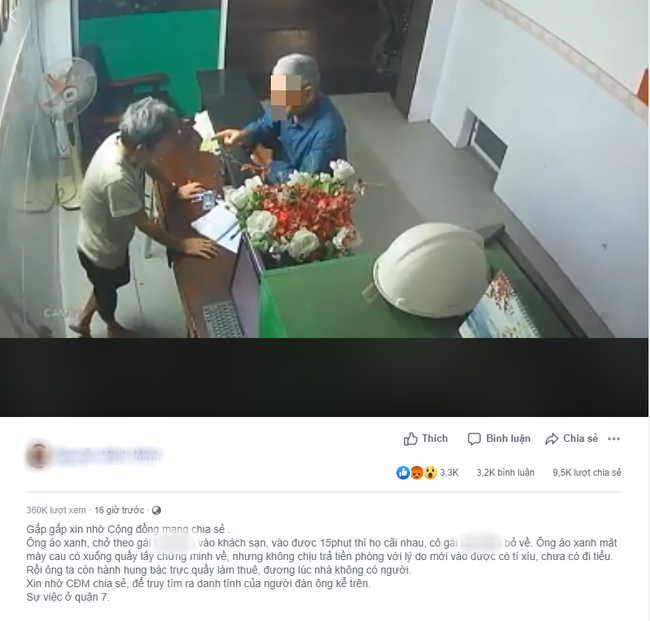 Nội dung được người đăng tải chia sẻ như sau: "Ông áo xanh, chở theo một người phụ nữ vào khách sạn, vào được 15 phút thì họ cãi nhau. Người phụ nữ kia bỏ về. Ông áo xanh mặt mày cau có xuống quầy lấy chứng minh về, nhưng không chịu trả tiền phòng với lý do mới vào được có tí xíu, chưa có đi tiểu. Rồi ông ta còn hành hung bác trực quầy làm thuê, đương lúc nhà không có người.