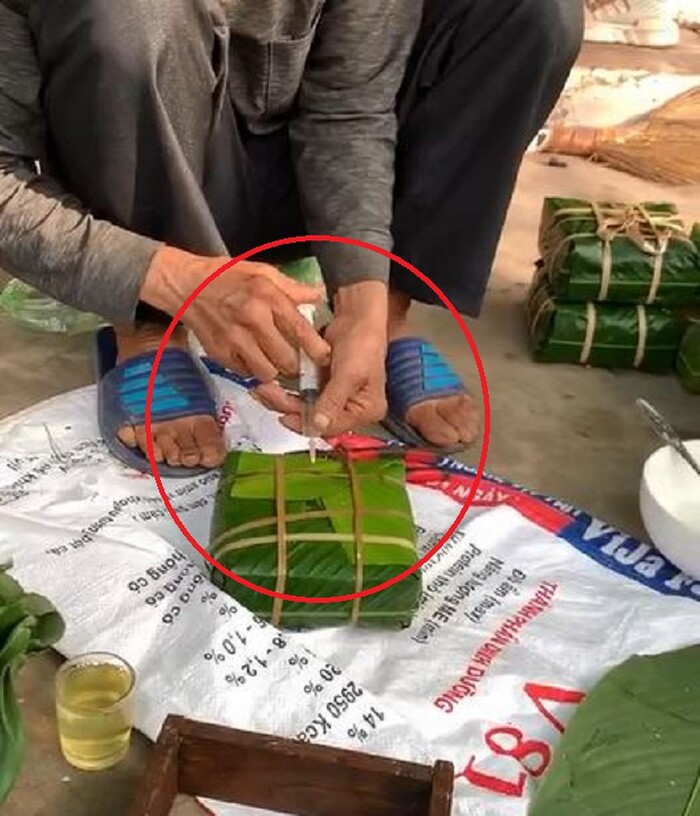Lúc này, một người đàn ông đứng tuổi đang dùng xi lanh tiêm chất lỏng gì đó vào từng chiếc bánh một. Không rõ dung dịch đó là gì nhưng người đăng tải clip viết: “Tết này không có bánh chưng rồi!”, bất giác làm nhiều người cảm thấy sợ hãi, vì cho rằng bánh chưng đang bị tiêm chất gì đó gây hại cho sức khỏe.