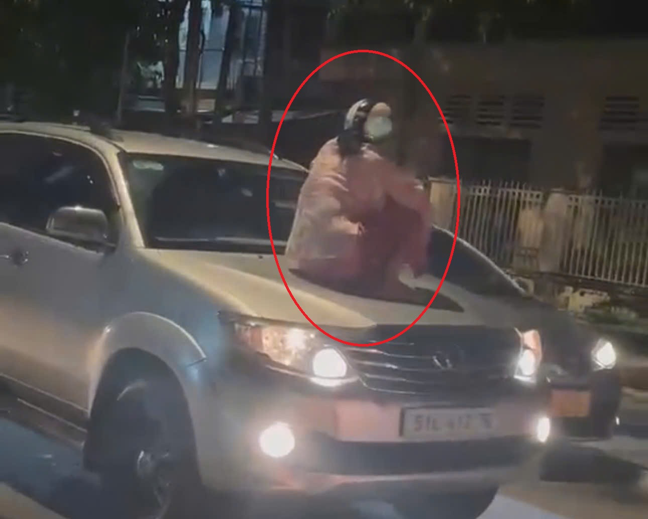 Theo nội dung clip, người phụ nữ trung niên đội mũ bảo hiểm, đứng trước đầu ô tô biển số TPHCM nói chuyện qua lại với một người đàn ông. Ngay sau đó, người phụ nữ bất ngờ leo lên nắp capo, tài xế thấy vậy cũng lên xe điều khiển chạy trên đường cùng dòng xe đang lưu thông.