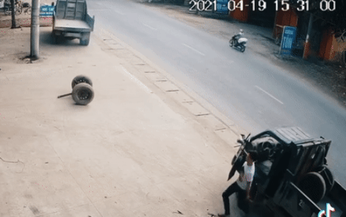 Theo đoạn clip ghi lại, một người đàn ông áo đen đang sử dụng trục bánh xe để nâng, di chuyển vật liệu xây dựng. Thế nhưng, ngay khi khối thép được nhấc bổng lên thì trục bánh xe cũng từ từ lăn xuống vì mặt sàn hơi dốc. Lúc này, người đàn ông áo đen vẫn không hay biết gì. Còn bánh xe cứ thế lao ra đường, các phương tiện thì vẫn di chuyển với tốc độ nhanh.